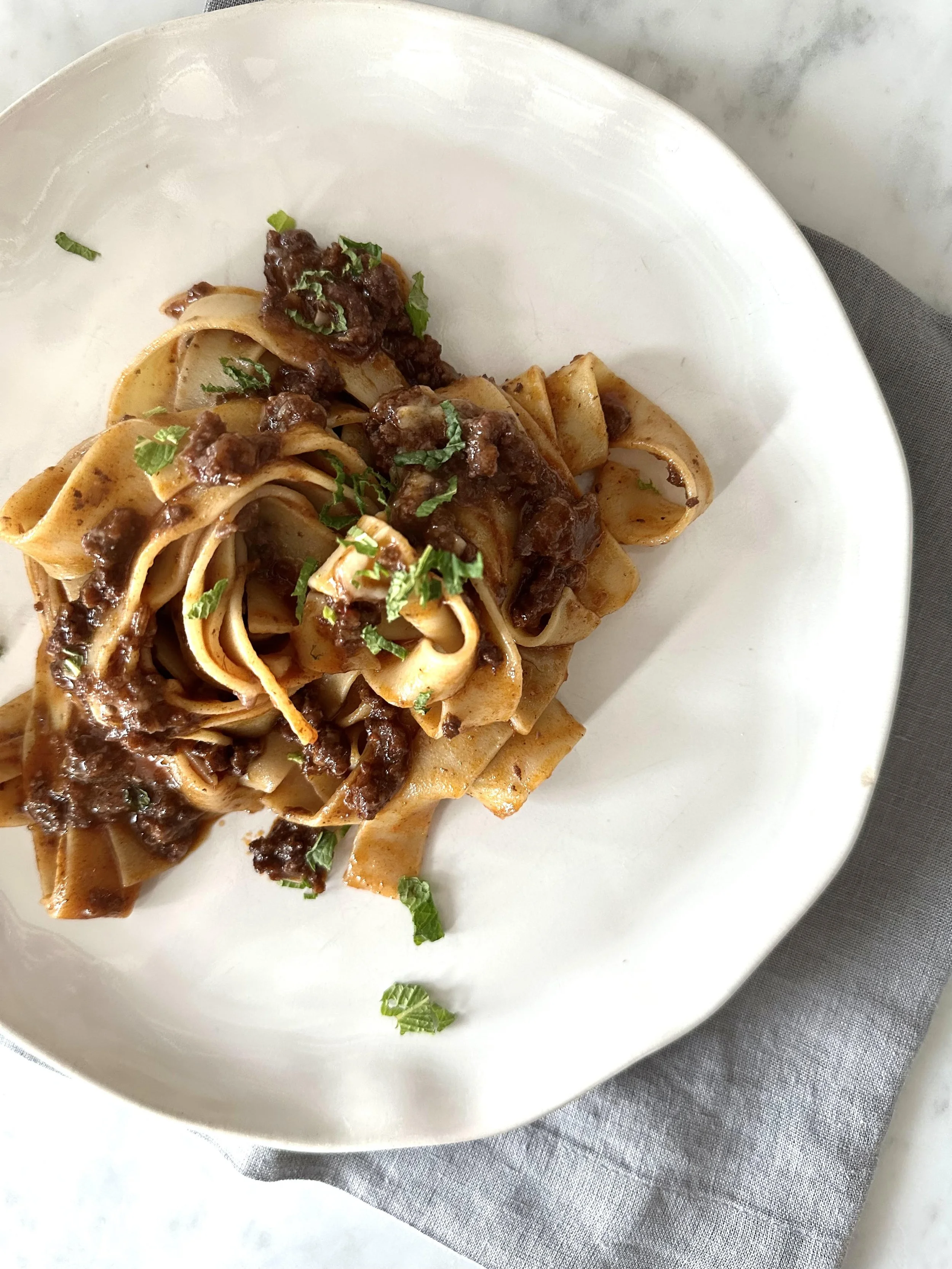 Heat 2 tabespoons of olive oil in a large dutch oven over medium heat. Add onion and garlic and sauté until translucent, about 5 minutes. Season with a pinch of salt. Add the entire bottle of red wine and over medium low heat, simmer and reduce the liquid until thickened and unctuous looking. Again, season with salt. This will take about 45 minutes.