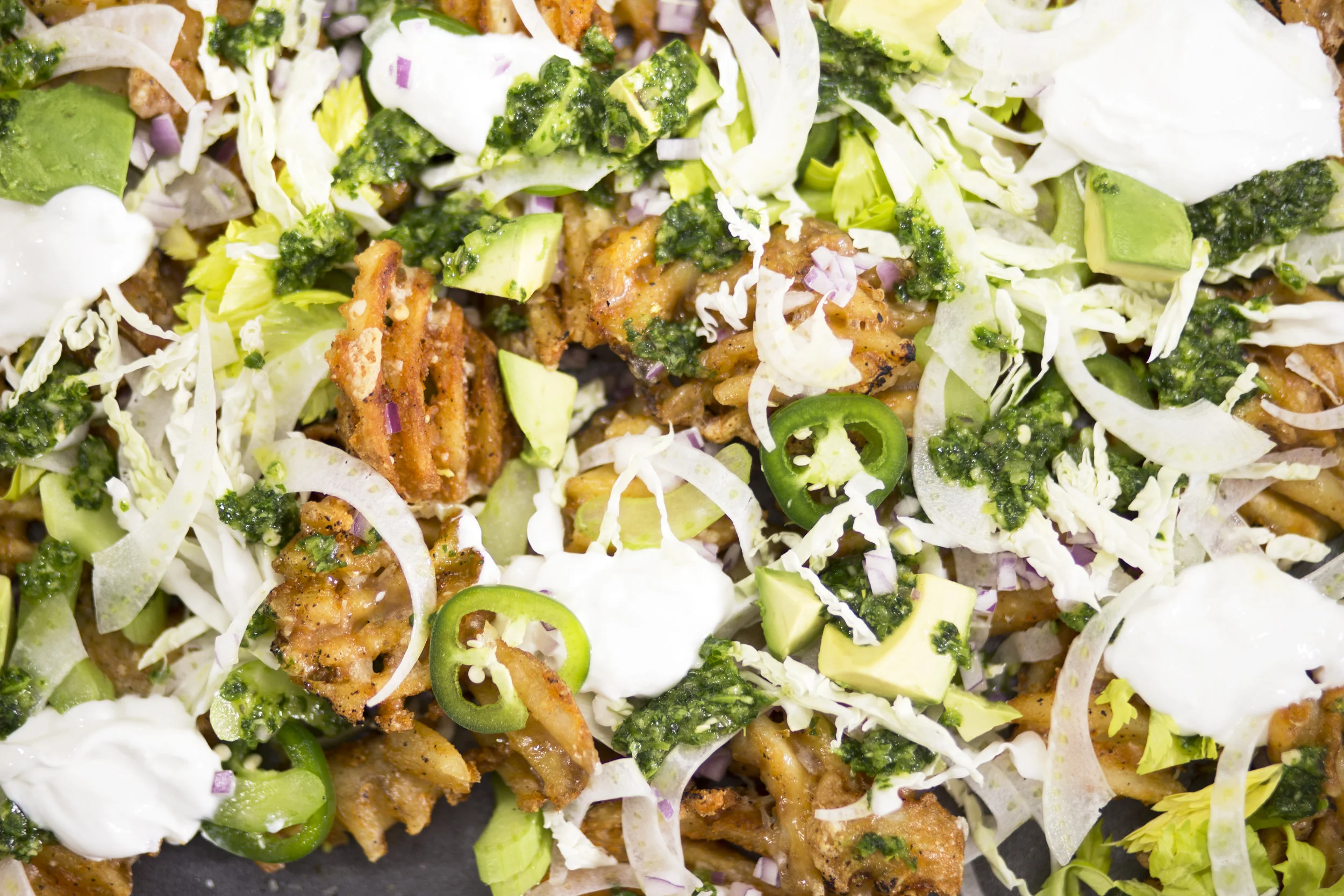 A whole new take on nachos with these potatoes. Simple to throw together and extra delicious, spicy and (somewhat) healthy. It’s like putting a salad on cheese fries – BAM!