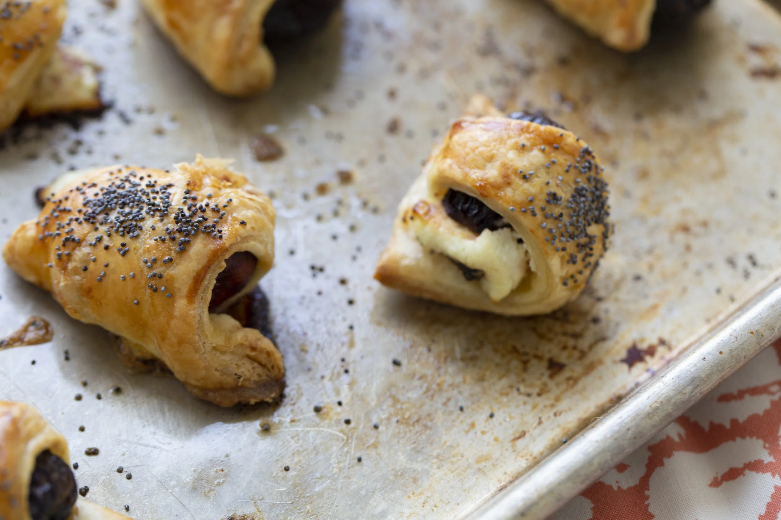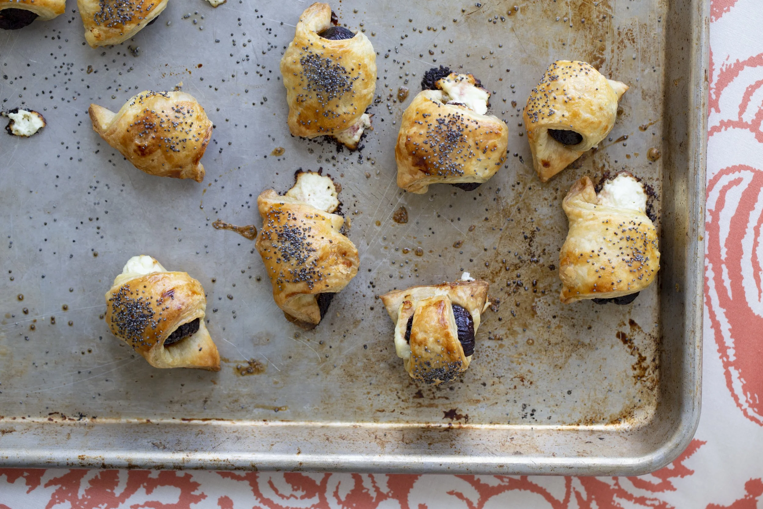 Roll puff pastry out until about ¼” thick. Cut in half equator way and then create 10 triangles on each half, creating 20 triangles total. Place the stuffed fig in the center of the puff and wrap tightly.